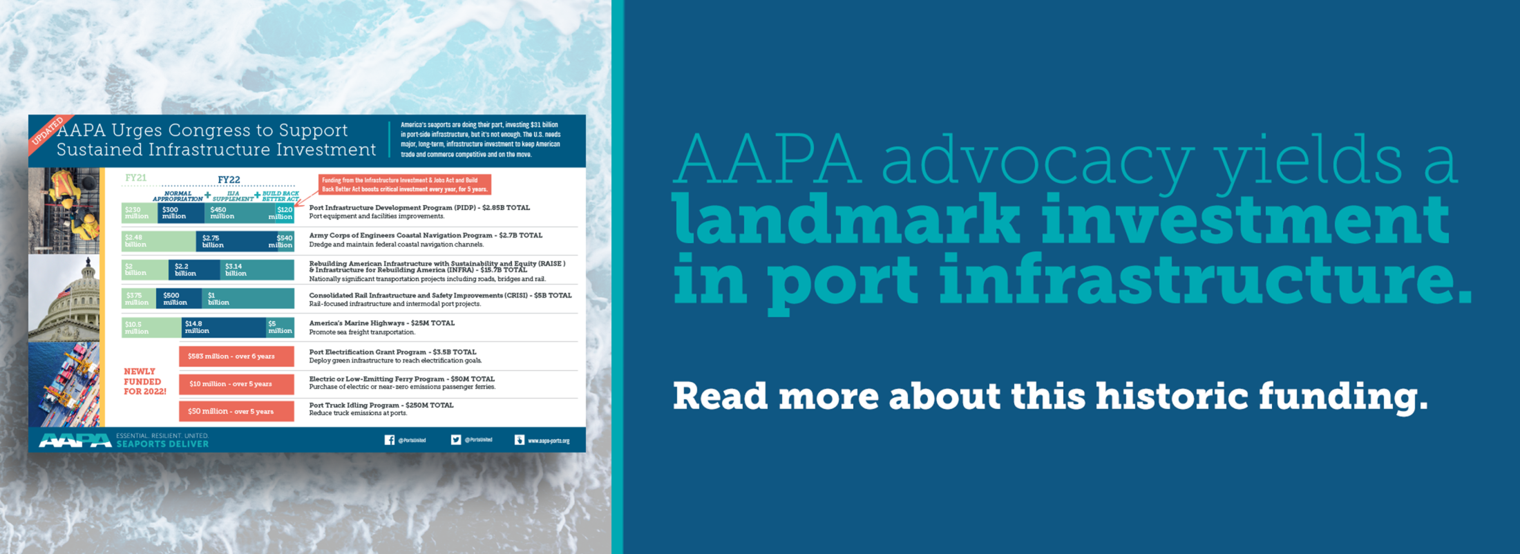 AAPA applauds the hard work of lawmakers, port leaders and transportation industry partners, as well as the Ports United Infrastructure Task Force to secure over $5 billion in the Infrastructure Investment and Jobs Act to support port programs.