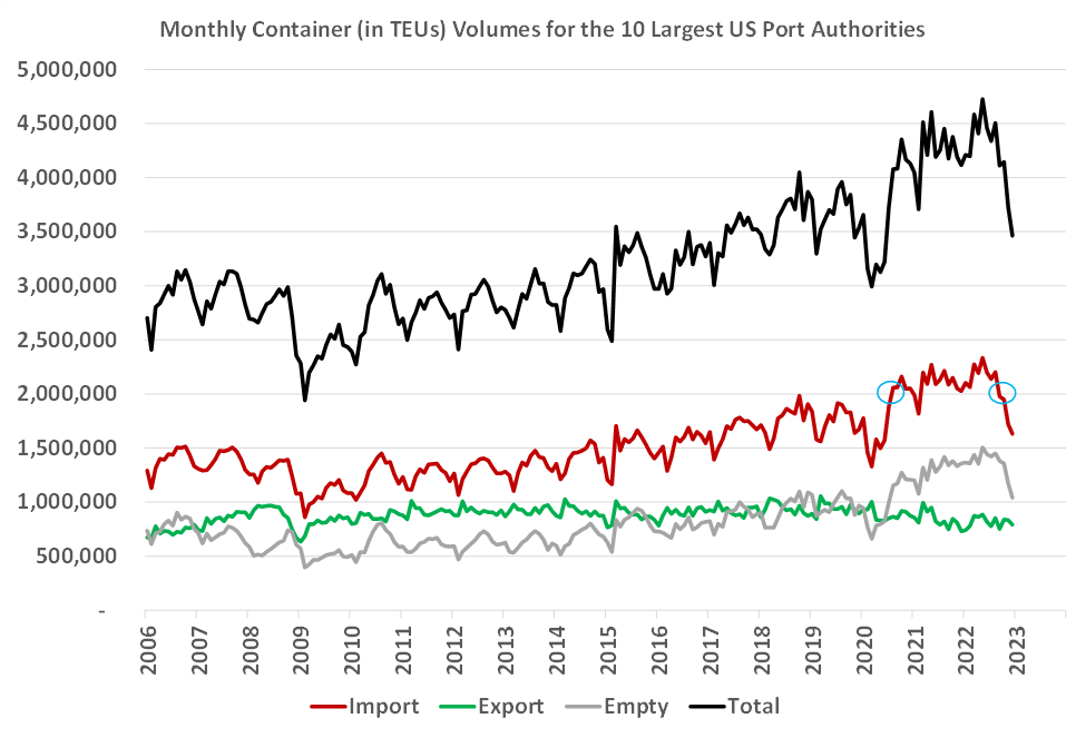 A global pandemic has to be near the top of the list of the most disruptive events that have affected shipping patterns, with every country and all segments of their economies being impacted. It is not surprising that freight movement, and container shipping in particular, has been struggling. This is quite visible in the chart below showing international container volume flows at the 10 largest container ports in the U.S. In August 2020, import volumes handled by these ports exceeded 2 million TEUs for the first time, and, except for February 2021, stayed at those peak levels for 25 months until August 2022.