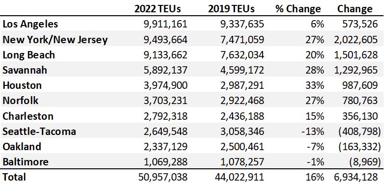 The impacts of the virtual siege on ports from August 2020 to August 2022 varied. The table below compares the calendar year 2022 volumes with pre-pandemic 2019 volumes for the 10 top container ports in the United States. Six ports have had double digit percentage increases and three have lower volumes.
