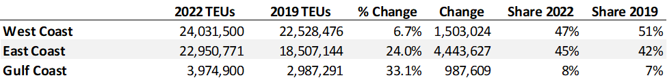 These factors underlie the change in market shares among the different U.S. coasts, based on the ten largest container ports, shown in the table below.