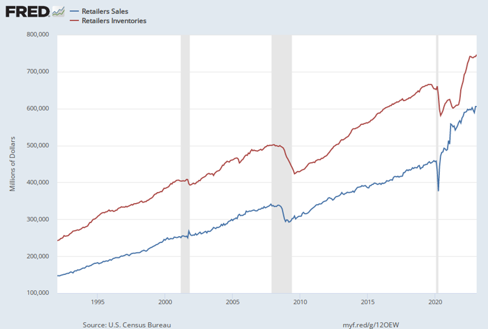 The first chart shows that retailers’ sales fell sharply when the U.S. economy shut down in the first half of 2020 but bounced back just as sharply by the middle of the year. This resulted in a sharp drop in inventories and Retailers struggled until January 2021 to get them back to the levels of March 2020. However, sales kept surging and only started flattening out in May 2022. However, the aggregate data doesn’t tell the whole story.