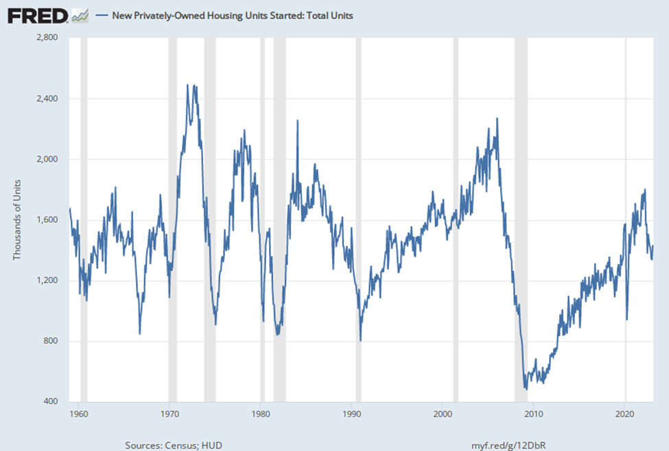 Since the residential real estate market crash in 2009, the U.S. spent over a decade with new housing starts below the long-term average of 1.43 million new starts per year. This implies that there is now a shortage of housing units in the U.S. Freddie Mac recently announced that the U.S. was more than four million units short of demand. Recent Federal Reserve interest rate increases have helped reduce construction of new housing that would have reduced inflation due to natural long-term demand for housing.